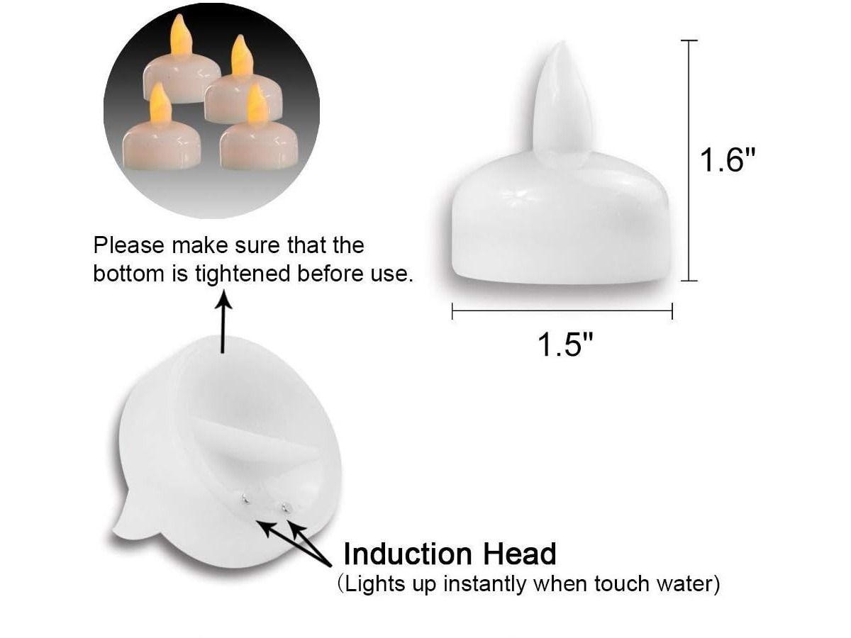 These floating tealights (D1.5" X H1.6") are completely waterproof. Put these warm white/amber yellow light led tealight candles in your pool and vase or bowls filled with water to create warm and romantic ambience.